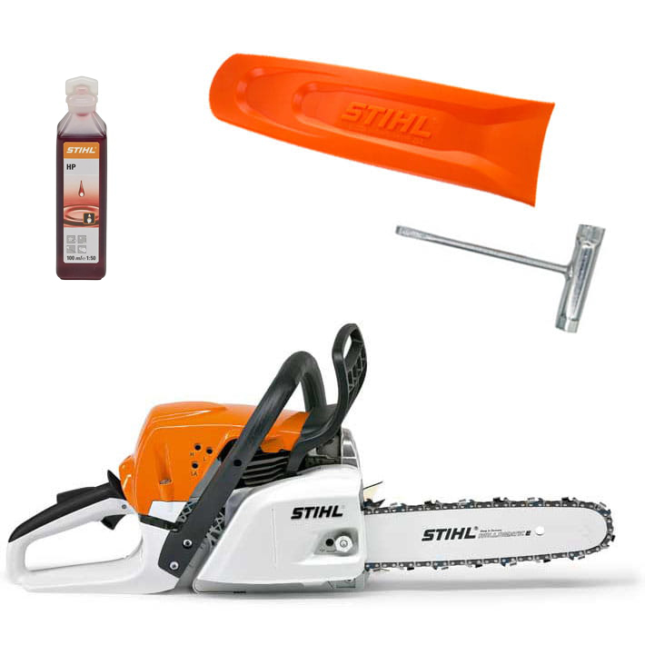 Pilarka waży 5,1 kg bez wyposażenia, a wartość drgań na uchwytach lewym i prawym jest taka sama i wynosi 3,9 m/s², co zapewnia równowagę i kontrolę nad urządzeniem. Pojemność skokowa silnika wynosi 42,6 cm³, co wraz z mocą 2 kW/KM pozwala na efektywną i dynamiczną pracę. W zestawie znajduje się również osłona na prowadnicę, klin do drzewa i olej Stihl HP 0,1 l.